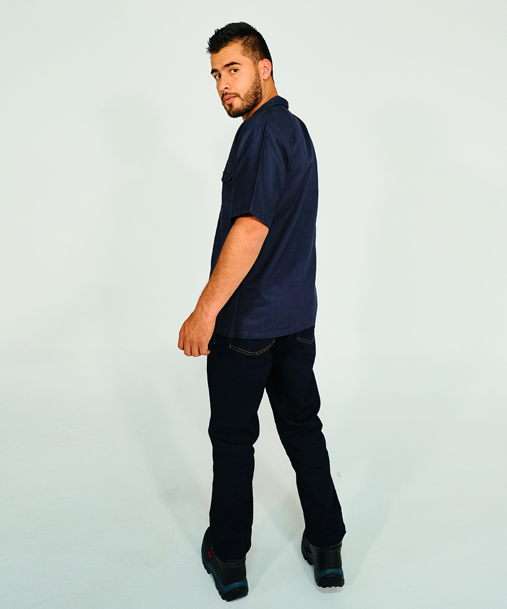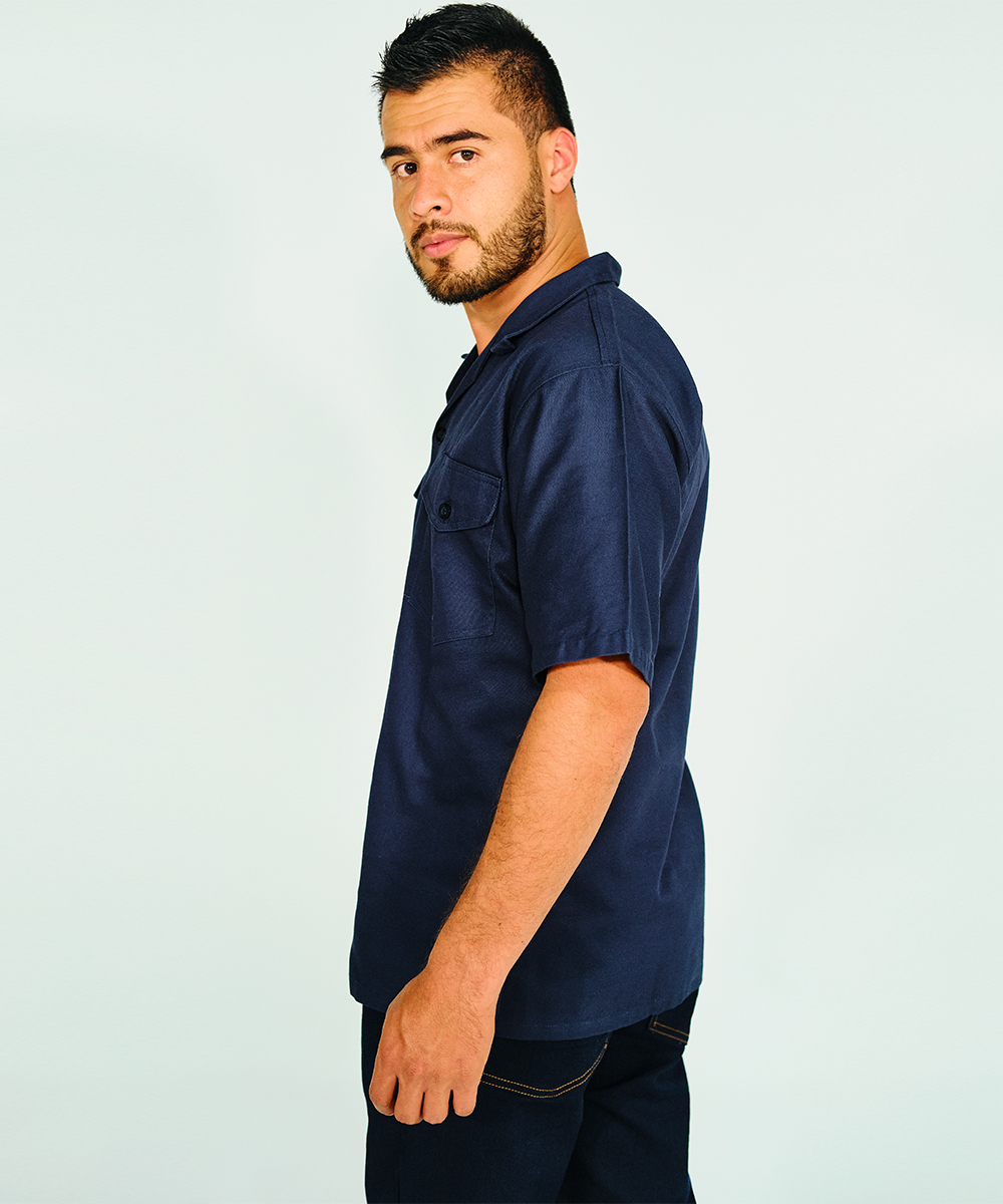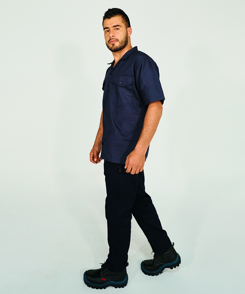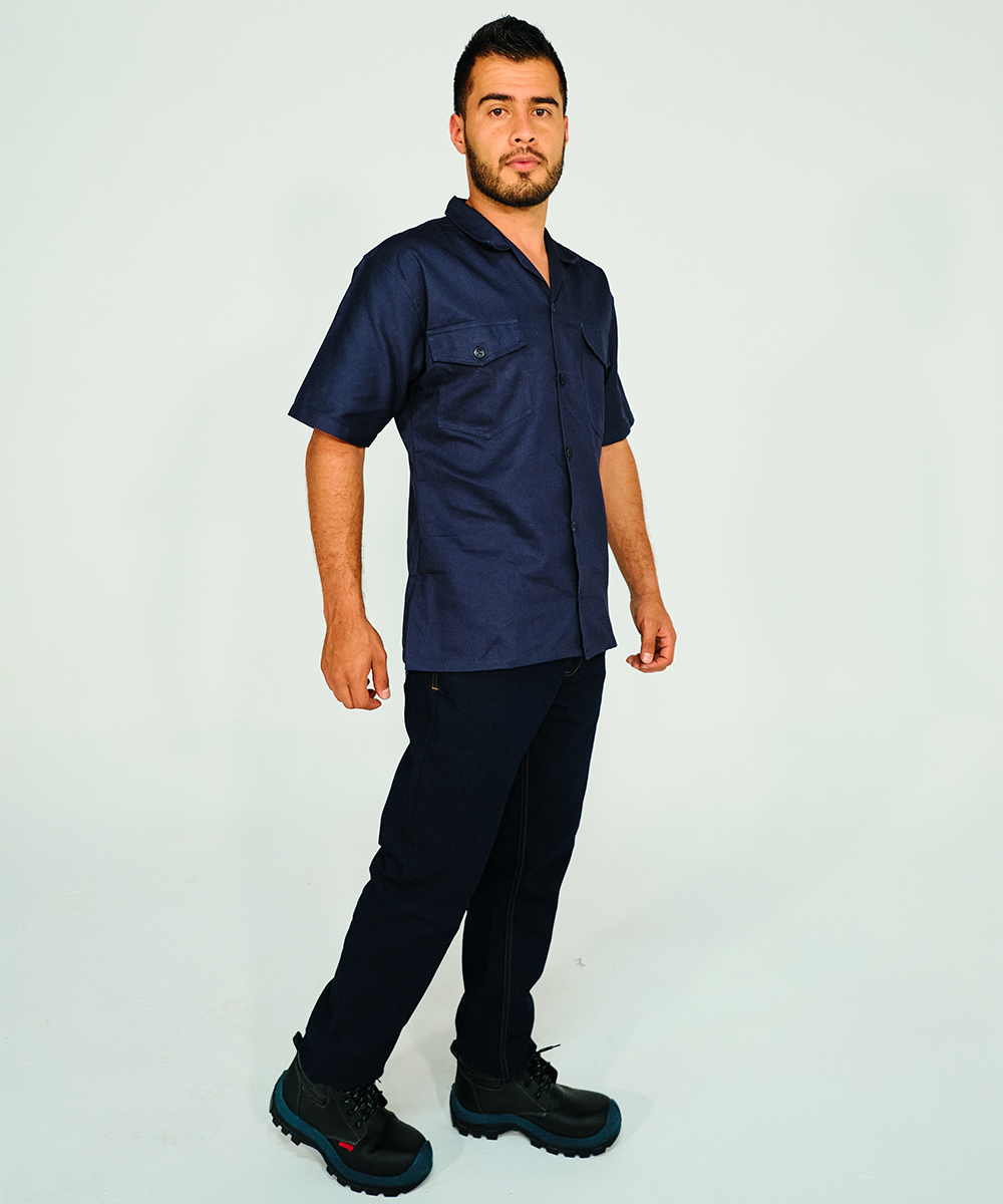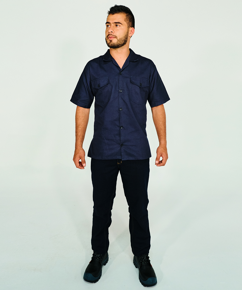 Short sleeve drill shirt, sport collar, two front pockets with flap and button, and placket with chalk (resin) buttons.