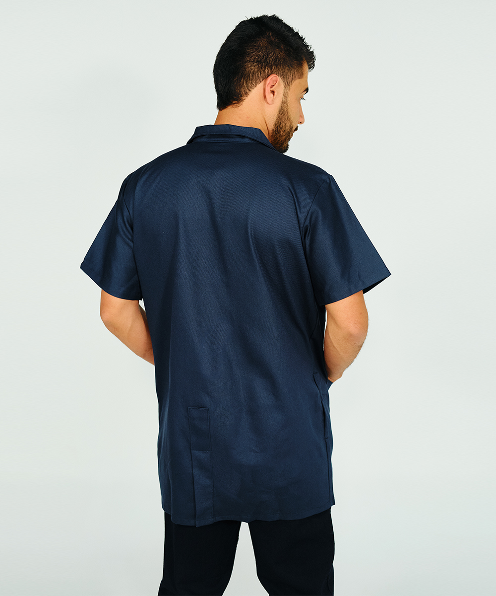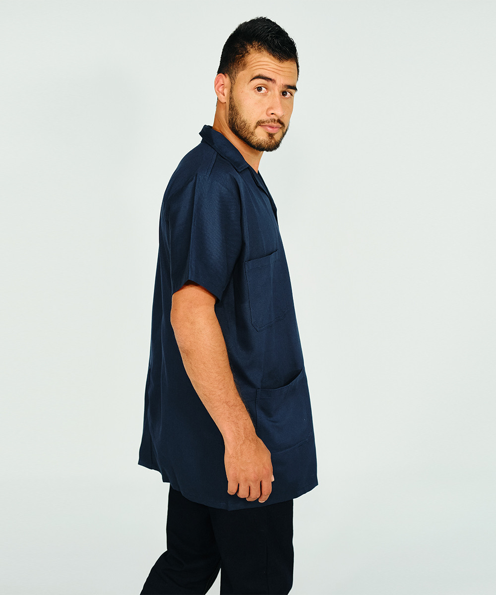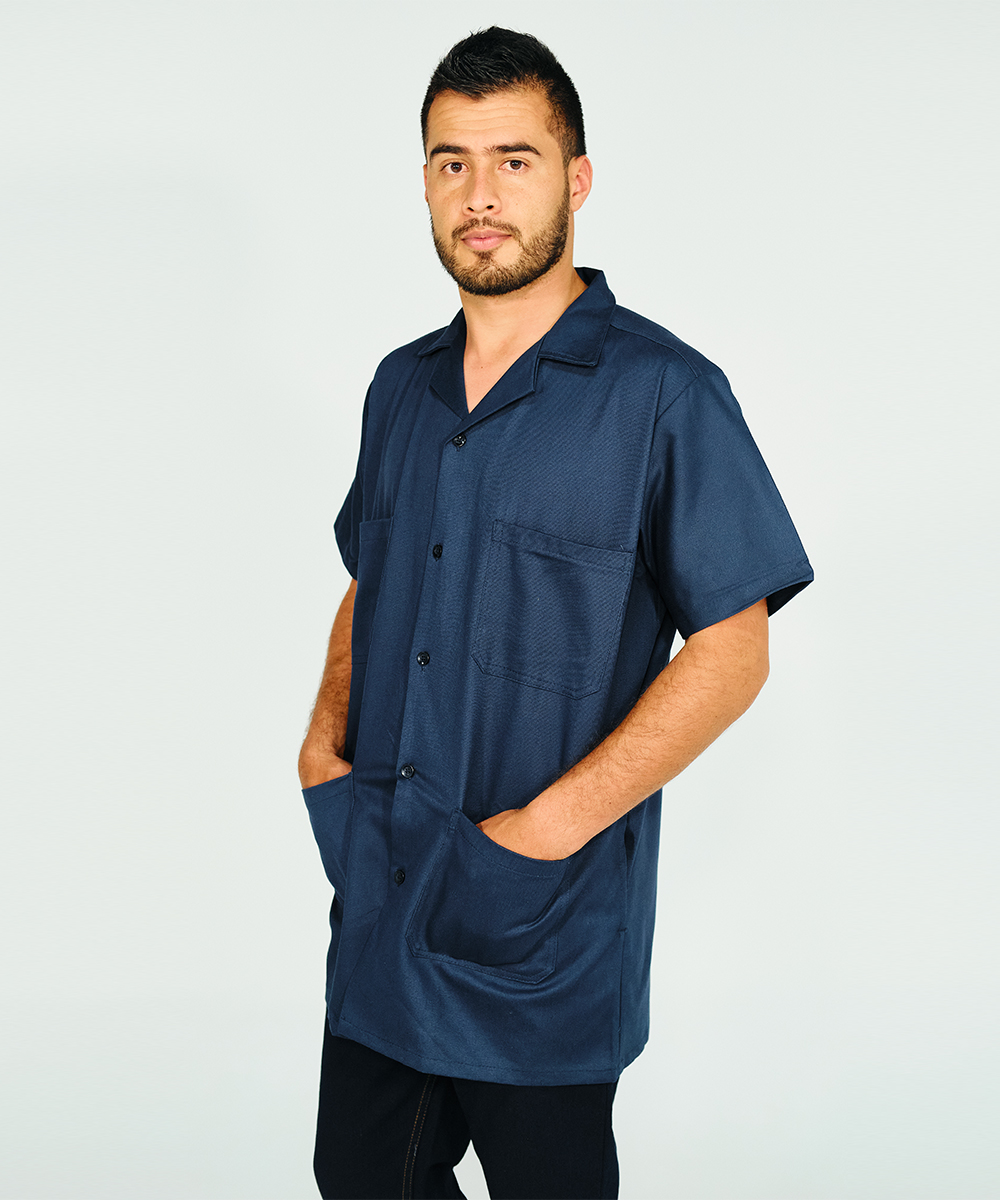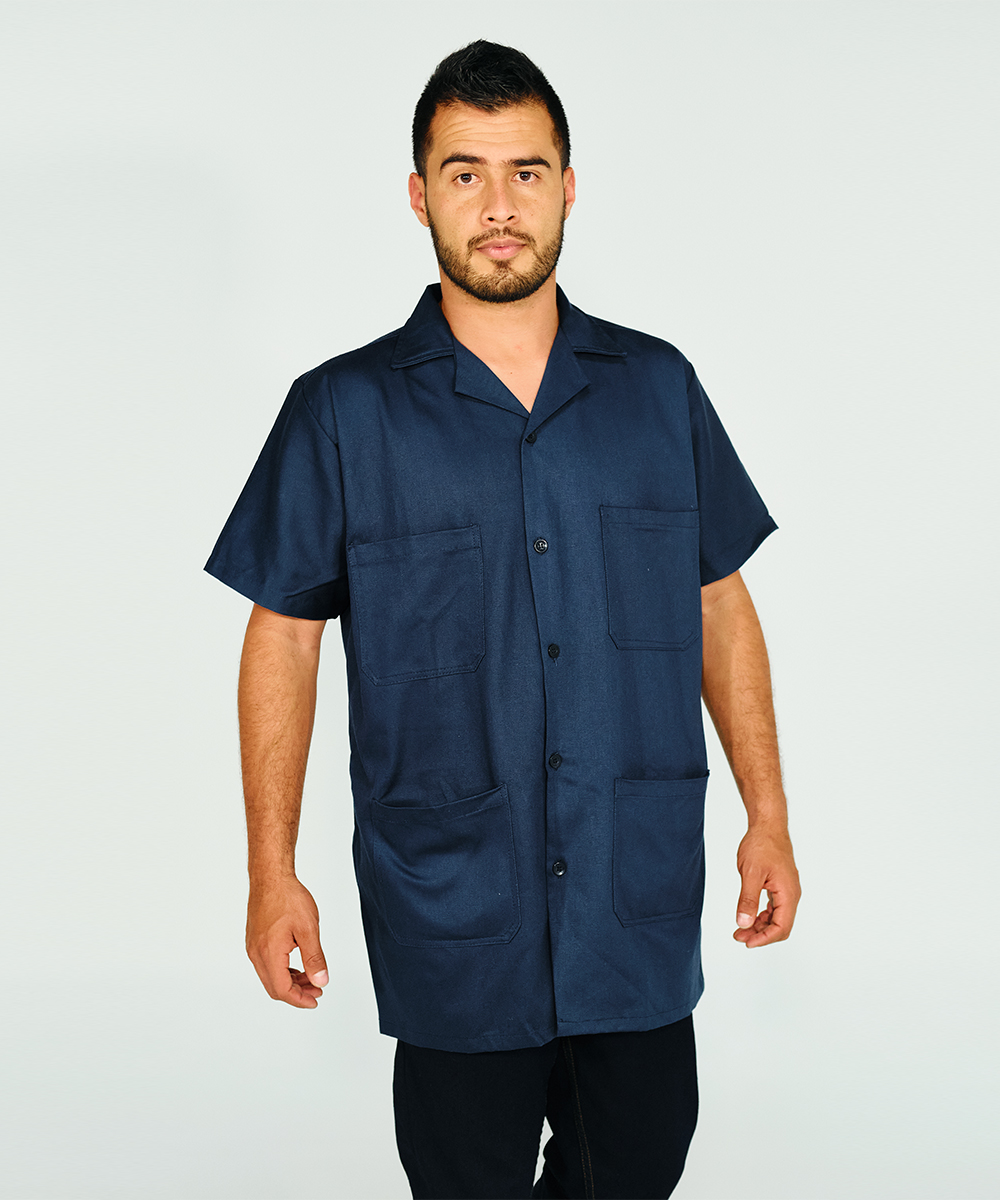 Short sleeve drill shop coat, sport collar, four front pockets, chalk (resin) buttons, and 10-cm-open back