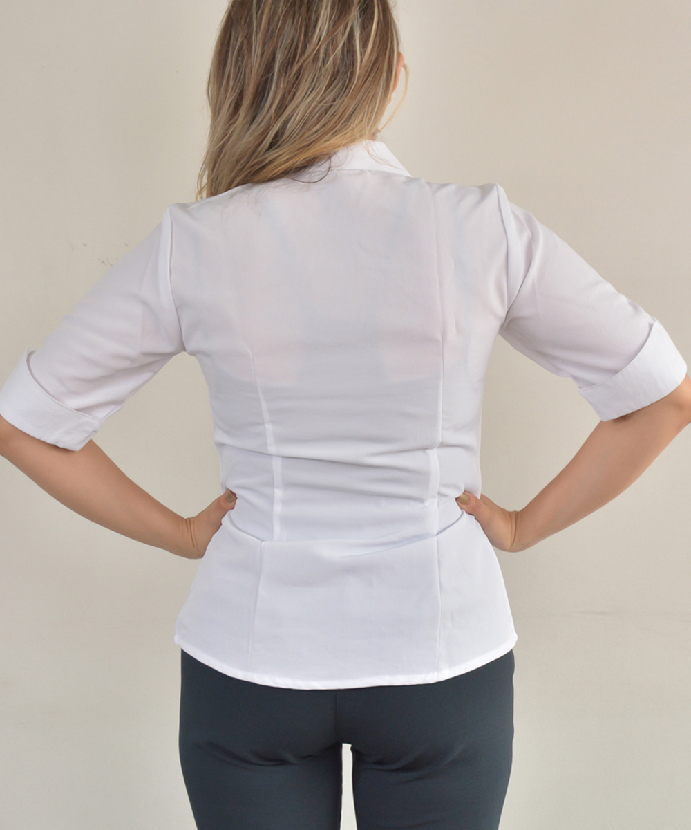 Women’s 3/4 sleeve white Lafayette shirt, princess style, with chalk buttons.