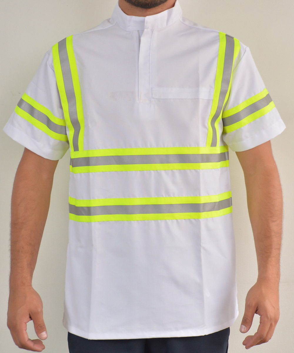 Camiseta de seguridad manga corta en drill liviano 6 Onzas, con acabado suave, con cintas reflectivas bicolor de 2” en frente, en espalda y brazos en poliéster, cuello militar con cierre, sin bolsillo. Cremallera de nylon del color de la tela de 20cm de largo.