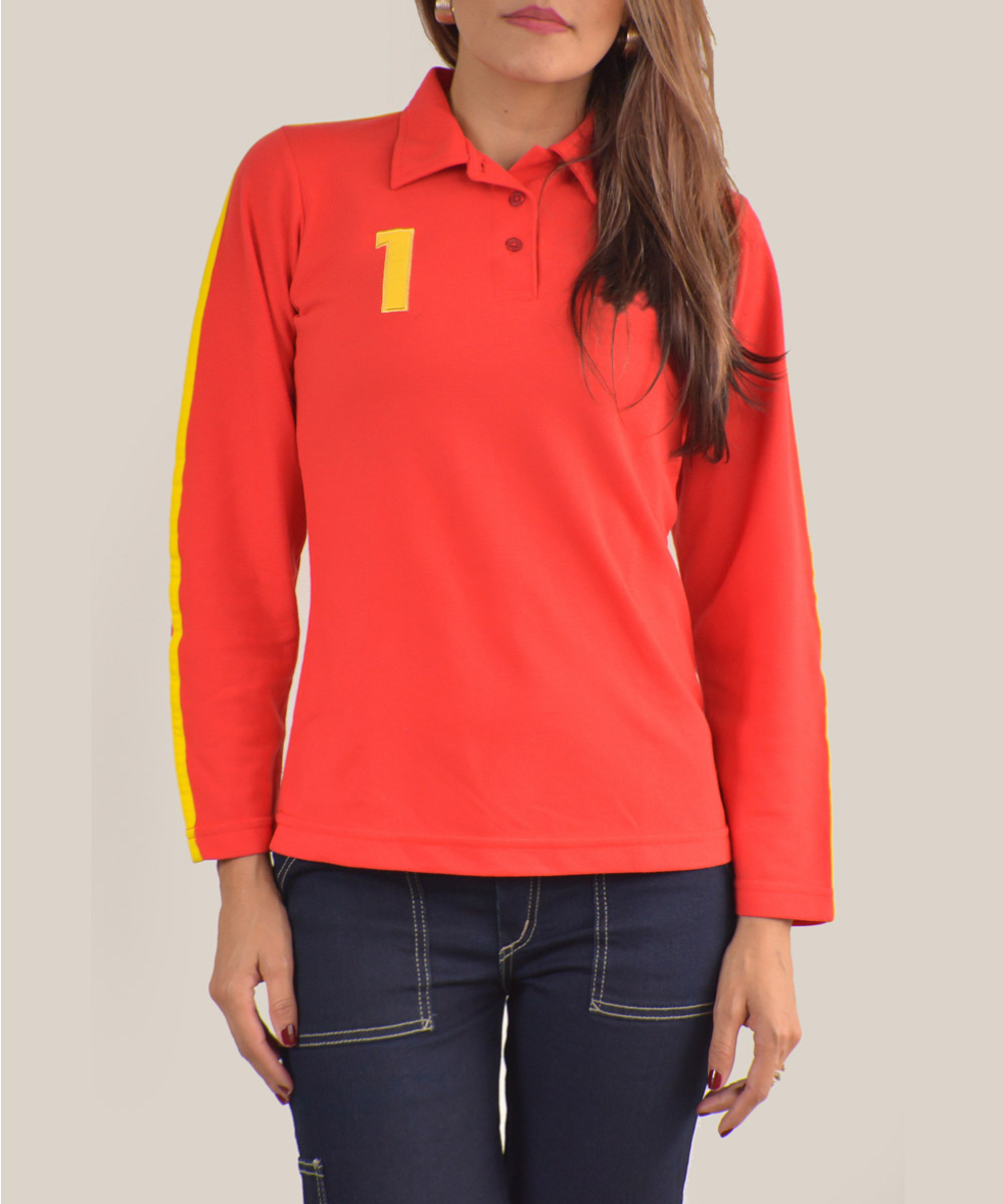 Camiseta tipo polo manga larga, con cuello y puño tejido, tres botones en perilla, con o sin bolsillo.